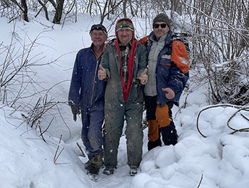 Вранці фортуна знову навідалась до нас. Це приїхав «Піф». Нас стало шестеро. Ми поснідали, зібрали спорядження і рушили на понор. Дорога на Монастирок була проїзна, а от з’їхати з неї на поле було неможливо. Довелось прокопати в снігу прохід для машини. Втратили півгодини, але хоч трохи зігрілися. Микола зумів заїхати по полю аж на верх горба. Далі був глибокий сніг і ми не ризикнули ставити автомобіль біля понору. Якщо минулого разу все спорядження учасники носили на собі, то тепер у нас були санчата! Нашому генератору таки сподобалось, як його постійно катали на них туди сюди 🙂. На полі снігу було мало, чого не скажеш про табір біля понору. Північний тин затримав сніг і його глибина сягала понад пів метра. Довелось розкопувати місце під багаття та шукати чайники. Сам колодязь теж був засніжений, однак прохід до печери залишився відкритим і можна було прямо по сніжнику з’їхати до «Сідниць». Ще зігнила та вломилась гілка над колодязем, через яку ми тягали мотузку.