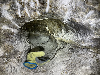 Всі три дні ми працювали в нижньому забої. Спочатку спробували цукерки, але з цього нічого не вийшло. Тоді перейшли до важкої техніки – перфоратора та відбійного молота. Виходило добре, але повільно. Весь час була хороша тяга повітря з поверхні в печеру. Тому вся пилюка від гіпсу летіла в середину печери, осідаючи на стінах білими порохами. В неділю на завершення робіт провели розвідку ходу, що попереду. Протиснутись і заглянути за поворот нікому не вдалось, однак вийшло просунути туди камеру та зробити відео. Воно не якісне, не вистачає освітлення та різкості, однак сильно заманює нас потрапити туди найближчим часом. Переглянути весь фільм можна тут.